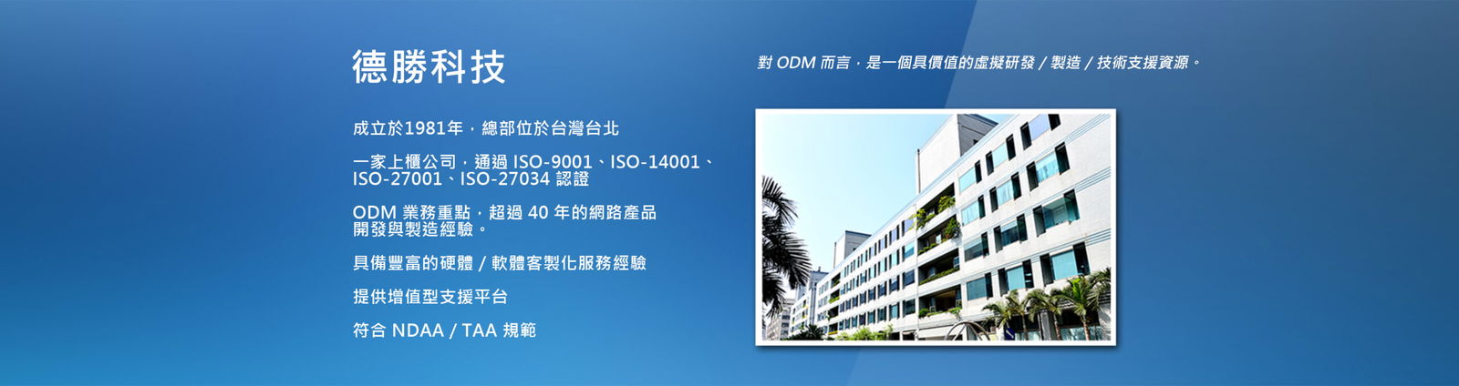 德勝科技是一家位於台灣的上櫃公司,專注於網路產品的 OEM/ODM 業務,產品類別包含 PoE 乙太網路交換器、工業型交換器、GEPON OLT/ONU 等。德勝科技的核心價值主張是:作為品牌客戶的虛擬研發(RD)、製造(MFG)與技術支援(TS)資源,成為長期且具價值的合作夥伴。